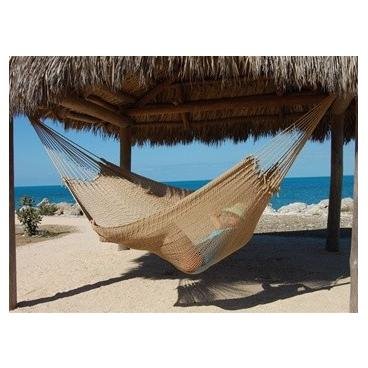 The Caribbean Mayan Hammock is the ultimate of all Mayans. Upgraded with thicker SOFT-SPUN POLYESTER cords that are robust and snag-proof, extra-large end cords, and heavy-duty metal end rings, this is the strongest, most-long lasting Mayan Hammock available. This family size 600-pound capacity hammock is perfect for a harsh outdoor environment and lasts up to 5 times longer than similar cotton chairs. The soft-spun polyester material will not rot, mold, or mildew. The Caribbean Mayan Hammock's 55-INCH wood spreader bar provides ample shoulder room for people of all sizes. It has multiple coats of MARINE VARNISH to protect against the elements, preventing the wood from rotting or decaying. The marine varnish also helps the wood retain its nice glossy finish and extends its life. This chair hangs easily from two suspension points 13 feet high or higher. Caribbean Mayan Hammocks are the largest, most comfortable hammock chairs you'll find anywhere. Relax! Features: Our largest, most comfortable hammock chair Family size bed: 55 inches wide by 86 inches long Color: Tan (see other color options ) Outdoor-friendly soft-spun polyester cord 55-inch-wide wood spreader bar with multiple-coat marine varnish Easily hangs from 2 suspension points Removable polyester seat is easy to wash 600-pound capacity Stand not included Specifications: Size: Jumbo (55 in. x 86 in. bed size) Spreader bar width: 55 in. Material: Soft-spun polyester Color: Tan Hanging height: 13 ft. or more Weight capacity: 600 lbs.