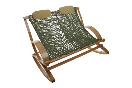 Specs: Overall width 48 inches. Polished white-oak frame. Steam-curved armrests. Heavy-duty zinc-plated bolts. Weight capacity 450 pounds. 2 pillows included. Soft-spun polyester rope available in white. DuraCord® rope choice of 5 colors. The Nags Head difference! Beauty is something that ought to be shared. The uncanny connection of multiple curves of steam-bent white oak makes our deluxe double rocker a must-see, must-sit experience for two. Combine all this captivating creativity with the characteristic deep comfort of the woven-rope seats, and youll be making excuses to sneak outside to sit. The doubled curves of the two bowed rocker runners buffer the front-to-back sway, creating one of the smoothest rides to nowhere youll ever have the good fortune to take. Reserve your seats now!