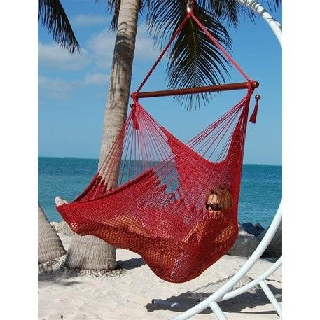 Hammock chairs bring style and relaxation to any décor. Our 3-foot by 7-foot Jumbo Hammock Chairs are hand-woven from extremely durable SOFT-SPUN POLYESTER and last up to 5 times longer than similar cotton chairs. Even if you hang the hammock chair outside, the soft-spun polyester material will not rot, mold, or mildew. Woven into the body is an extra-long extendable footrest that lets you really stretch out. The 47-INCH-WIDE wood spreader bar provides ample shoulder room for people of all sizes. It has multiple coats of MARINE VARNISH to protect against the elements, preventing the wood from rotting or decaying. The multi-coat marine varnish also helps the wood retain its glossy finish and extends its useful life. This chair hangs easily from one suspension point that is 8 feet high or higher. These are the most comfortable hammock chairs you'll find anywhere for such a low price. Relax! Features: Soft and comfortable Extra-long 7-foot design with built-in footrest Color: Brick red (see other color options ) Outdoor-durable soft-spun polyester cord 47-inch-wide wood spreader bar with multi-coat marine varnish Hangs easily from one suspension point Removable seat for easy cleaning 295-pound capacity Specifications: Size: Jumbo (3 feet x 7 feet bed size) Spreader bar width: 47 in. Material: Soft-spun polyester Color: Brick red Hanging height: 8 ft. or more Weight capacity: 295 lbs.