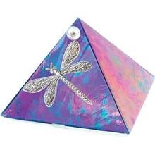 Pyramid 2 in - bi glass dragonfly. Bi. Dragonfly. Dragonflies represent new light and joy. It is the light that can allows us to see past the illusion. When we beleive that our physical conditions can prevent us from changing. the dragonfly reminds us to let our true color come through by using our own inner light.. Blue iridescent is the color of integrity, imagination and knowledge.. Each Art Glass Wishing Pyramid has a mirrorred base and a door that opens from the top with a little crystal ball. Ancient Egyptians used the pyramids to generate, transmit and transform energy, known to be a great thoughts amplifier. It is considerered the most positive talisman on Earth. Pyramids can be used to energize crystals, pendulums, garden seeds, water, essential oils, and most of all your thoughts. Write a wish on a piece of paper and insert it in the pyramid... Comes with a trilingual information card (English, Spanish, French) Gift boxed. Made in Canada. Copper Leaf