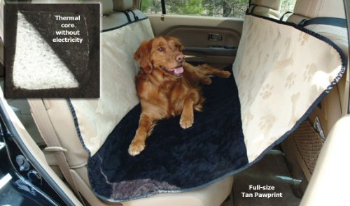 * Keep your dog cozy warm AND your back seat clean with this deluxe vehicle hammock * Made of heavy-duty Microfibre Suede with quilted plush lounging area * Thermal core in lounging area reflects your pet's body heat back to him Protect your backseat and keep your pet cozy warm without electricity. Made of hard-wearing, easy-clean microfibre suede and plush polyester. Resists stains and soiling. Thermal core found inside the plush material reflects your pet's body heat back to warm without electricity. Available in Full-size 55" x 56-1/2" or Single 26" x 53-1/2". Both use durable, adjustable nylon straps that attach to headrests, rear top strap, or rear seatbelt anchors. Please specify color.Colors: Charcoal Pawprint, Denim Pawprint, Tan Pawprint.Please click on "More Information" for cleaning and installation instructions. heated seat cover quilted seat cover deluxe quilted seat hammock reflective heat pad bench seat cover bucket seat cover rear seat cover half seat cover thermal core 34786 34787 Self-Warming Deluxe Quilted Hammocks
