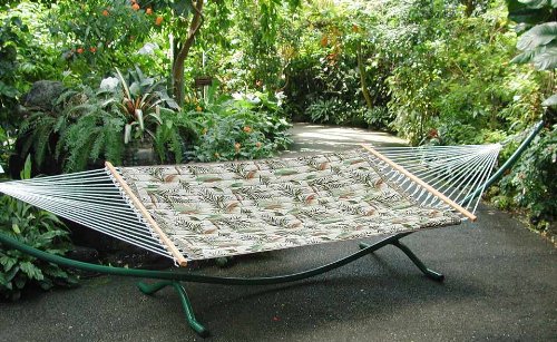 The hammock is made from weather-resistant spun polyester fabric. It is securely anchored with hardwood spreader bars. There are different fabric patterns on reverse sides of the hammock. It is fashioned with thick polyester rope hand-woven macrame clewed ends Enhance your indoor or outdoor living area with this relaxing hammock.