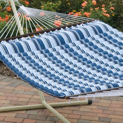 The Nautical Pillow Top Hammock takes relaxation to new levels. This hammock features quilted fabric with pillow batting inserts that form an indulgent contoured surface that will envelop your entire body in supportive comfort. A nautical design with stripes in navy light blue and white on fade- and weather-resistant outdoor fabric will add color and charm to your outdoor setting. This hammock is designed to accommodate one or two adults looking for some well deserved relaxation. A wide sturdy wood spreader bar keeps the hammock flat and comfortable and makes getting in and out of the hammock easy.The dimensions of the hammock bed itself are 6 feet in length and 4 feet 6 inches in width. Overall this hammock stretches a total of 11 feet 5 inches and requires a hanging distance of at least 13 feet with a 16-foot maximum. Hanging hardware is included so you can enjoy your hammock right away. Place your order today and prepare for full-body relaxation. About Island Bay HammocksIsland Bay Hammocks come to you directly from the skilled hammock artisans of Chennai India. Using the latest technology alongside time-tested traditional methods of construction these hammocks are woven with the pride of their makers.