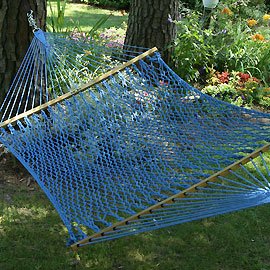 This Coastal Blue DuraCord Rope Hammock by Pawleys Island combines the traditional rope style with a new and exciting color. Part of the Beach Collection by Pawleys, this large rope hammock measures 55 in wide, which makes it large enough for two people. It features solid oak wood spreader bar, zinc plated hardware and the most beautiful blue DuraCord rope. The DuraCord rope is as soft as cotton and as durable as polyester, making it a true winner for outdoor use. It's colorfastness and UV resistance will help keep the blue color longer than any other rope. Pawleys Island have been making hammocks since 1889 and have featured top of the line hammocks and rope funriture since then. This hammock is new Original