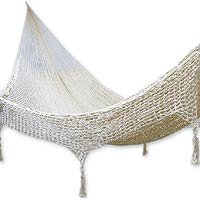 Soft natural ivory evokes the powdered sugar sands of the Mexican Caribbean. Woven by hand this king-size hammock is bordered with crocheted lace and tassels. Maya Artists of the Yucatan create it in the same way they have for centuries. Long before the Spanish arrived upon the coasts of the Yucatan Peninsula the Maya preferred to sleep and rest in hammocks. They considered the hammock to be like the loving embrace of a mother due to the comfortable manner in which the body is held and swung within its cradle. Maya Artists of the Yucatan seek to preserve time-honored customs while also offering stylized versions of the original Maya hammock. For them the hammock is a work of art. Their hammocks are incredibly comfortable easy to maintain and may be stored just about anywhere. It easily packs for travel to the beach or lake. Extender ropes (measuring 1 meter) hammock hooks ( S hooks) and step-by-step instructions included for easy installation. NOTE: Because each is woven individually by hand measurements may vary by as much as ten centimeters. There may be slight color variations from hammock to hammock. Holds up to 550 lbs.