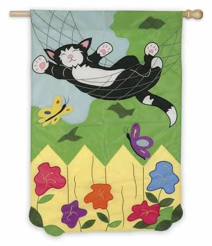 Ah, to be a cat. With nothing to do but lay around all day, waiting for a tummy rub. Transfer your love for that tuxedoed treasure into a delightful yard and garden accent with our cat in a hammock house flag. It features an enchanting cat character taking the sun in his hammock, hung over a garden by the back fence. A gift that is purr-fect for cat lovers. Appliqued. Weather Resistant. 28 x 44 inches.